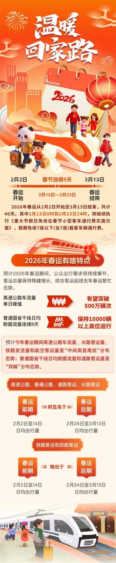 预计2026年春运期间,公众出行需求将持续攀升,客运总量保持稳健增长,高速公路车流量单日峰值有望突破500万辆次,普通国省干线辆以上高位运行,综合客运延续去年春运繁忙态势。