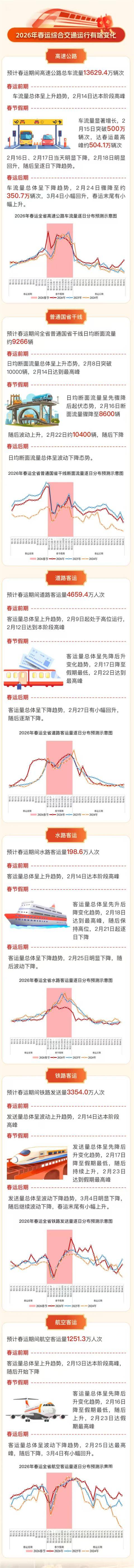 2026年春运(2月2日至3月13日)期间,全省平均气温较常年同期偏高,平均降水量较常年同期偏少。从总体时间分布来看,预计今年春运期间高速公路车流量、水路客运量、铁路发送量和航空客运量呈“中间高首尾低”分布态势;普通国省干线日均断面流量和道路客运量呈“双峰”分布态势。高速公路、普通公路、道路客运、水路客运春运前期(2月2日至14日)日均出行量明显高于春运后期(2月24日至3月13日)日均出行量;铁路客运和民航客运春运前期(2月2日至14日)日均出行量略低于春运后期(2月24日至3月13日)日均出行量。